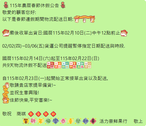 115年農曆春節休假公告 敬愛的顧客您好: 以下是春節連假期間物流配送日期: 最後收單出貨日:國曆115年02月10日(二)中午12點前止 02/02(四)~03/06(五)貨運公司提